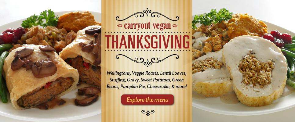 Thanksgiving Carryout Preorders are available in single Entrées, Dinners, and Family Packs. You may also order larger quantities of corned-beef and Italian-style seitan, herbed stuffing, mashed sweet potatoes, mashed regular potatoes, gravy, jalapeño corn fritters, and Mac 'n Cheese. AND, we have cakes by the slice or whole as well as whole pumpkin and apple pies.